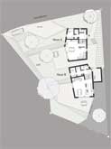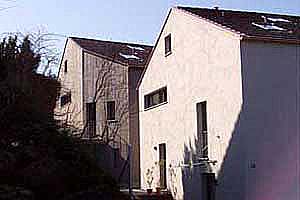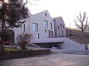 Die Geschosse innerhalb des Hauses sind zueinander versetzt und folgen der Geländeneigung. So gelangt man von allen erdgeschossigen Räumen direkt ins Freie. Der Grundriss nimmt Bezug auf die schiefen, naturgegebenen Ränder der Parzelle. Das führt zu einer ungewohnt plastischen Form der Neubauten. Bei aller Freiheit und Leichtigkeit orientieren sie sich aber in Stellung, Dachneigung und Material an der dörflichen Umgebung. Dominant bleibt über den Häusern der bewaldete Bergrücken. |