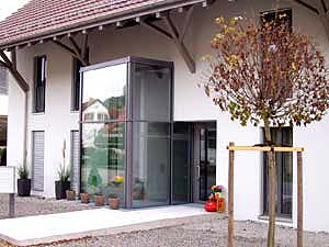 Der Neubau schliesst eine Baulücke im historischen Dorfkern von Untersiggenthal, der aus den typischen Bauernhäusern besteht mit Scheune und Wohnteil. Vordach und Scheuentor Der gläserne Vorbau mit dem Treppenhaus und das grosse Vordach nehmen die Motive der Bauernhäuser auf..