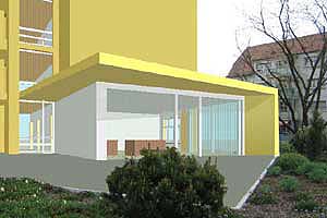 der Flur . der manchmal letzte Bewegungsbereich der Alten, wird hinaus auf die Terrasse verlängert in Form eines Vordaches. Er endet in einer abgewinkel- ten Wandscheibe. Es entsteht eine Übergangszone zwischen innen und aussen, wo man auch bei Regen geschützt im Freien sitzen kann. |